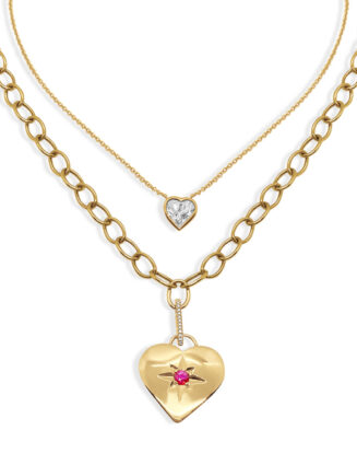 A beautiful heart fixed at the center of a delicate chain inside a bezel surrounded by milgrain. This necklace exudes an elegant. sophisticated simplicity that easily swings from casual to formal. with the change of a dress. 14kt Gold 2.5cts Simulated Diamond 16" Delicate Chain Exquisitely Handcrafted in Los Angeles