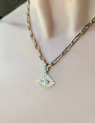 The detail that makes up our Diamond Eye of Providence Pendant is incomparable. Its bezel set marquis-shaped center diamond is gloriously surrounded by hand-etched rays of light and hangs from a pave diamond bale. We offer the pendant alone. on our Baby Bad Boy Link (shown in 1st image) or Baby Rolo Chain (shown in…