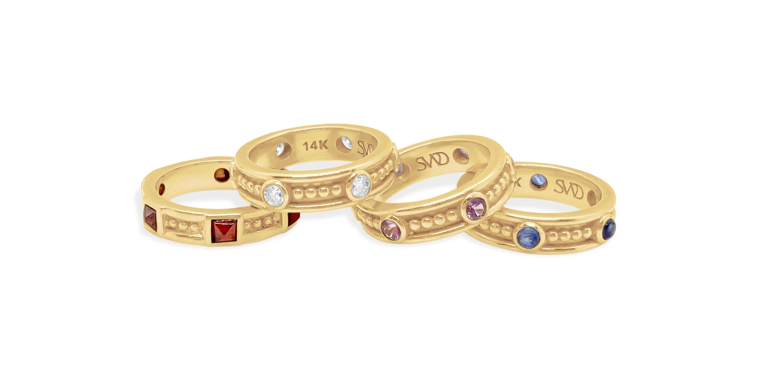 OG SWD?… Your wish is our command with the return of these luscious. ornate. stackable bands. Available in pink tourmaline. green tourmaline and garnet. Please inquire about other stone options. Sold individually. NOTE: 3 Week Delivery