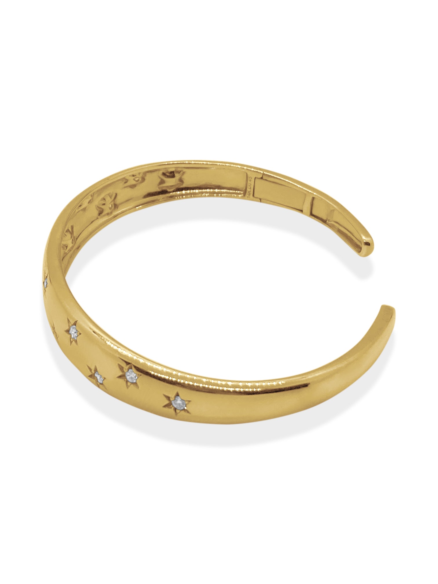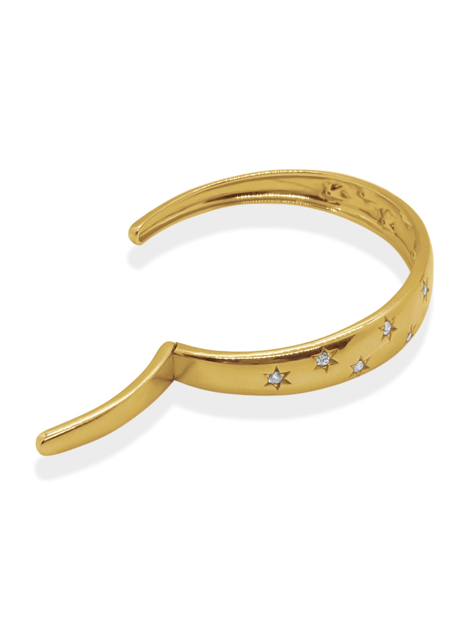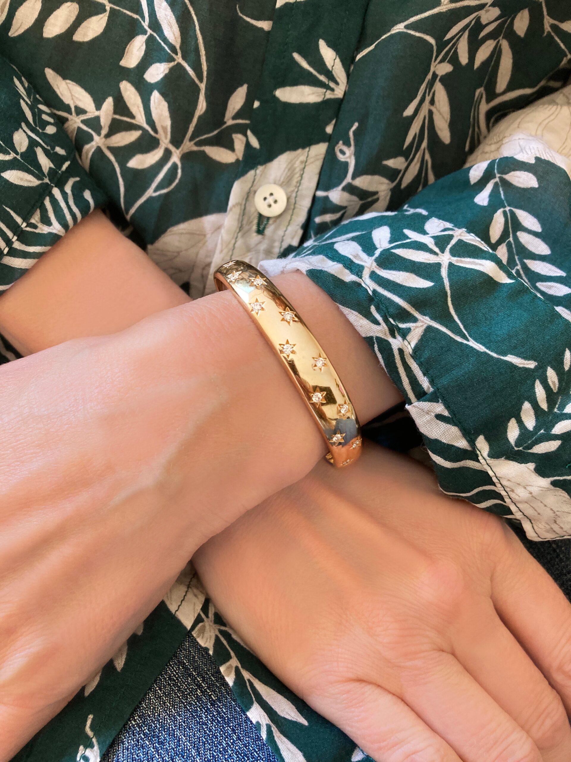 Is there one perfect bracelet in the universe? Highly unlikely. but our Diamond Gypsy Cuff comes close. Just the right amount of scattered diamond stars; just the right width; just the most convenient. invisible hinge for easy on/off. Yep… pretty darn close.
