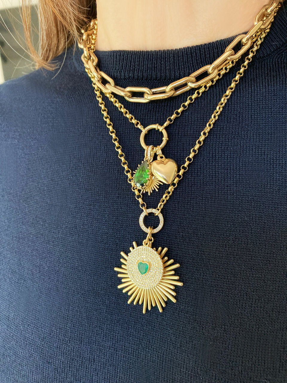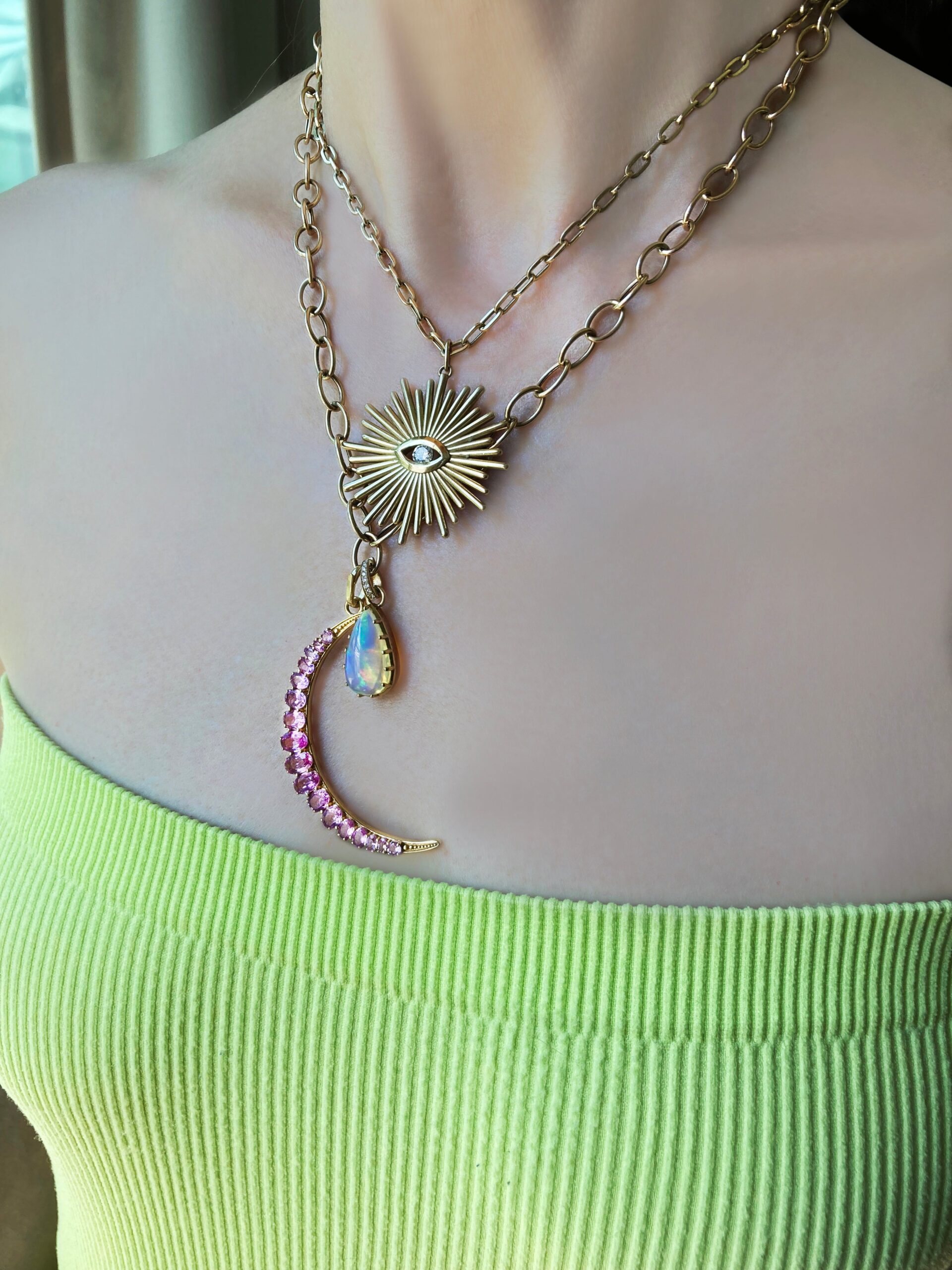 Please contact our studio if you would like to custom order with a Sapphire center. Ruby Center. or any other precious stone. or semi precious. Chain shown is listed in options for purchase. but we can recommend alternatives. just shoot us a text!