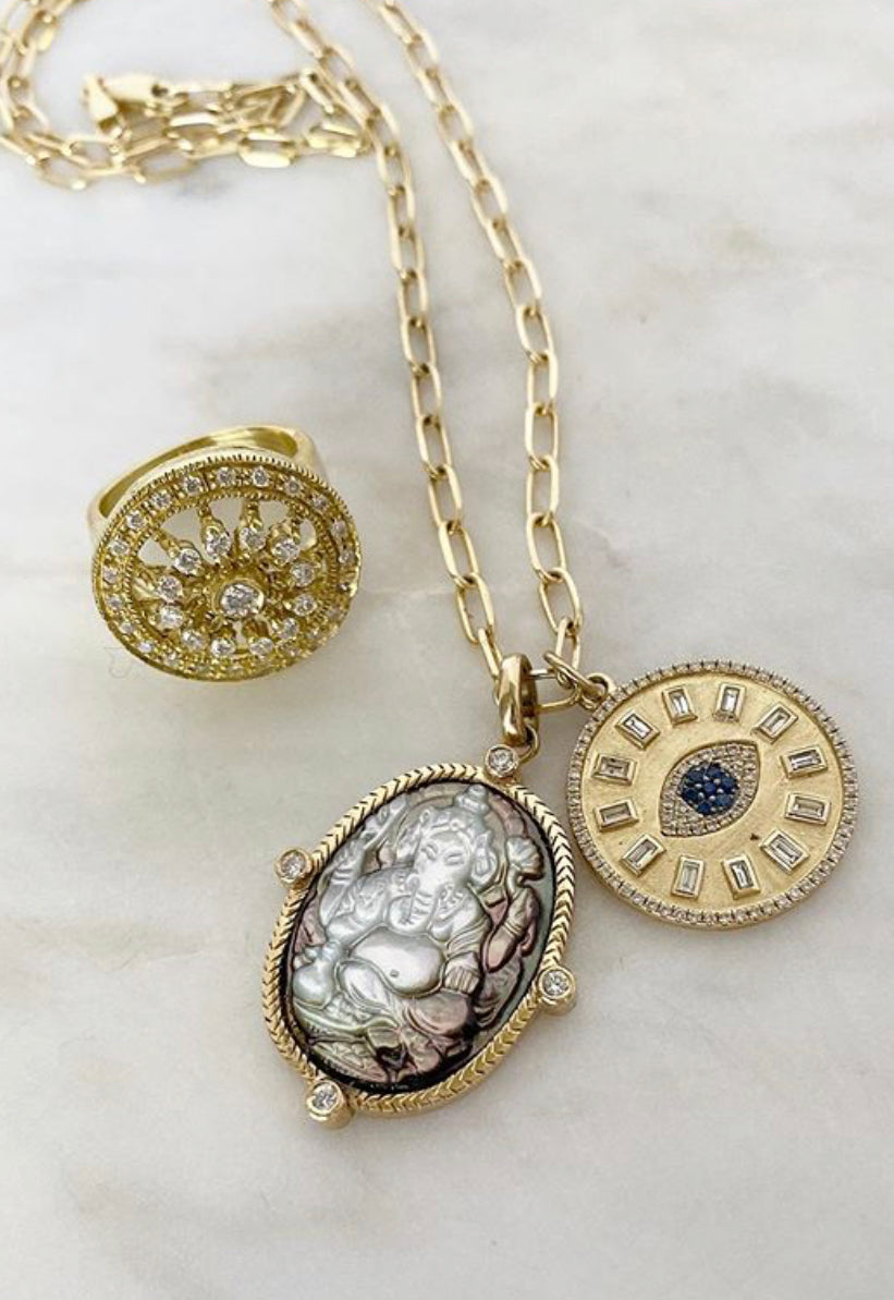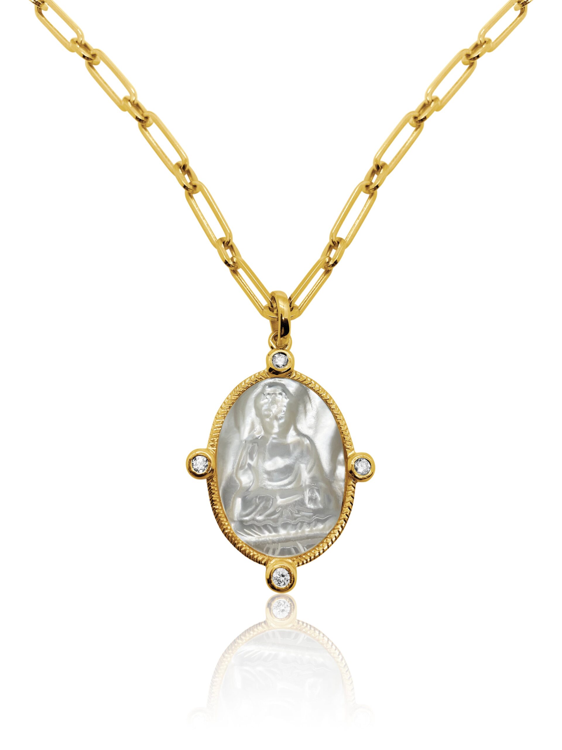 Striking on its own. this Mother of Pearl Buddha rests in a gold frame with four diamond points (shown in black Ganesha in first image). Paired with our Paperclip Necklace. it pops beautifully worn at 16 inches or makes for a great layering piece at 18 and 20.