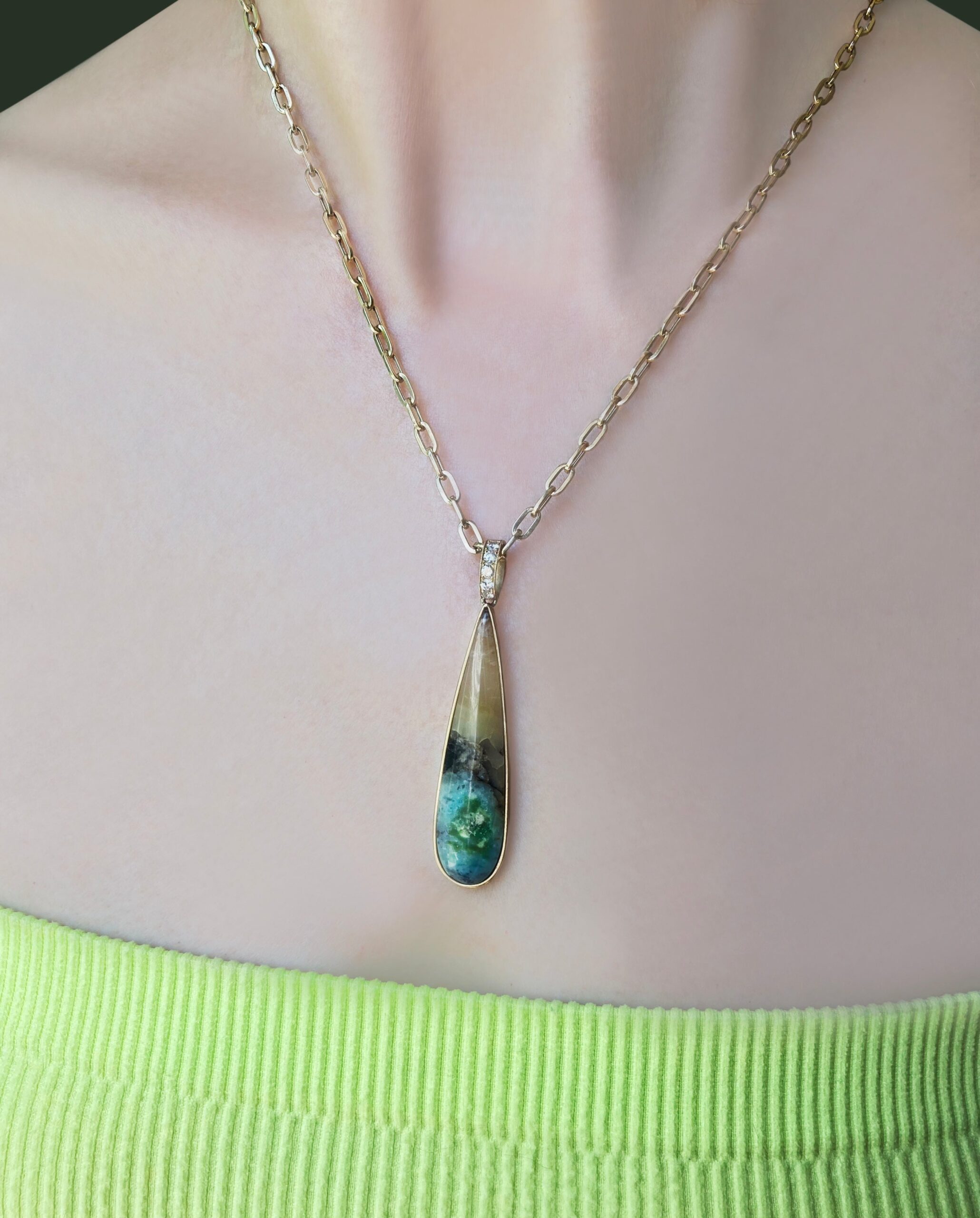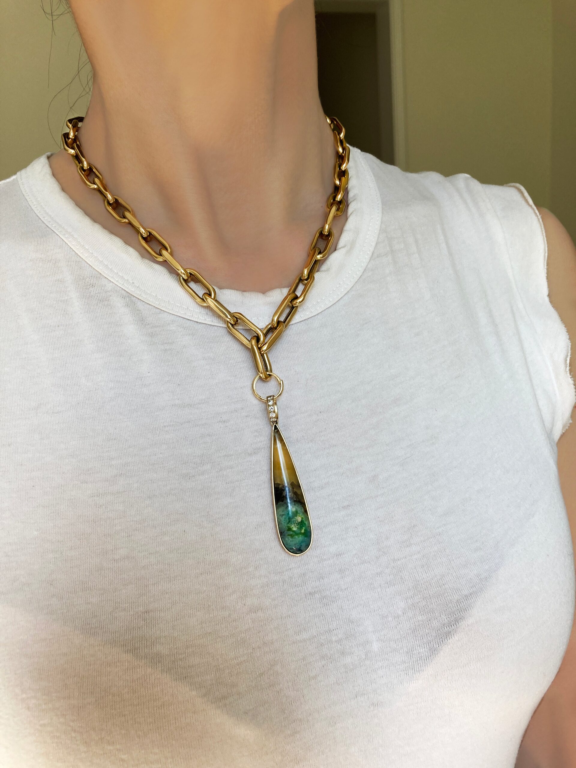 Available as pendant or on two chain choices: Baby Media Link or our Big Bad Boy Chain which includes an enhancer. The beauty of the enhancer is it allows you to mix things up and connect the drop to any other chain or charms in your collection. *If this item is showing as SOLD please contact our studio. We have a hand picked selection of one-of-a-kind drops we can customize for you!*