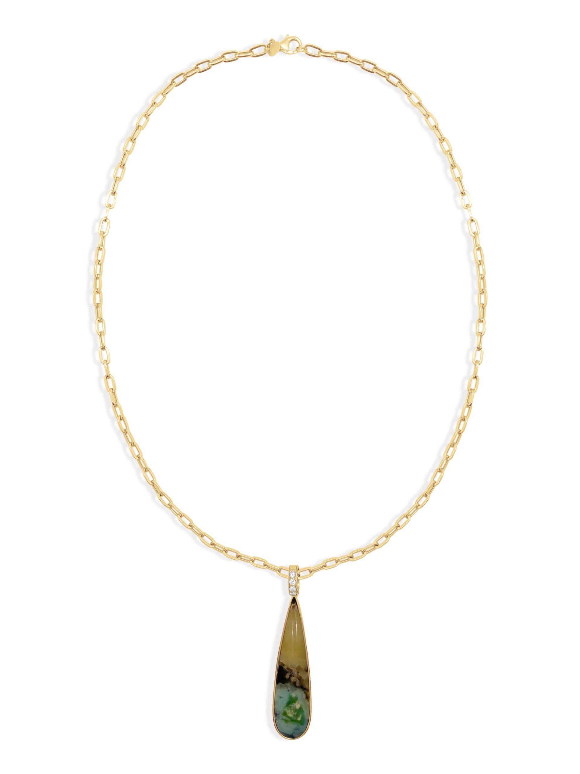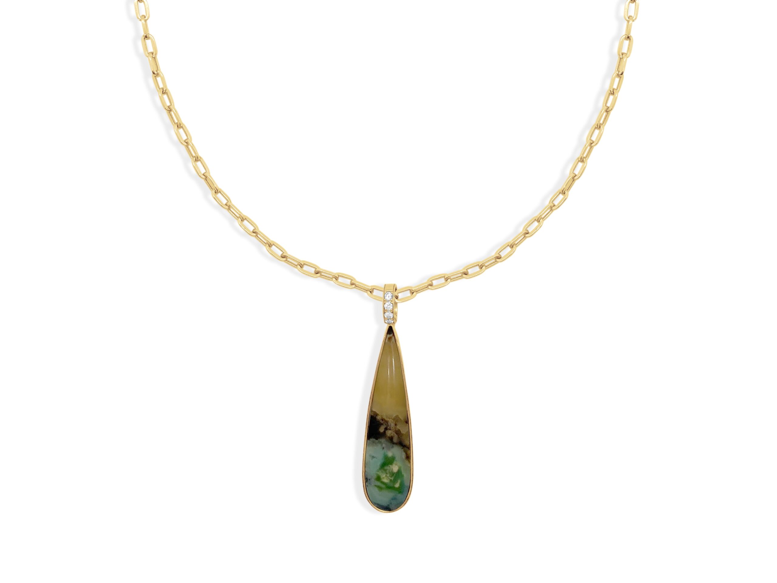 Beautiful cabochon Boulder Opal Drop with pave diamond bale. Colors only Mother Nature could provide! This pendant looks stunning alone or layered with other necklaces.
